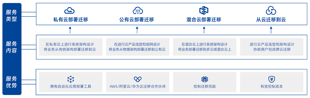提供业务上云及云间迁移的端到端服务,,评估业务系统现状,,,,规划设计迁移架构、、、迁移技术和迁移方案,,应用及数据上云迁移实施,,云上系统部署,,云上数据及业务验证,,迁移后运维保障及持续优化服务。。